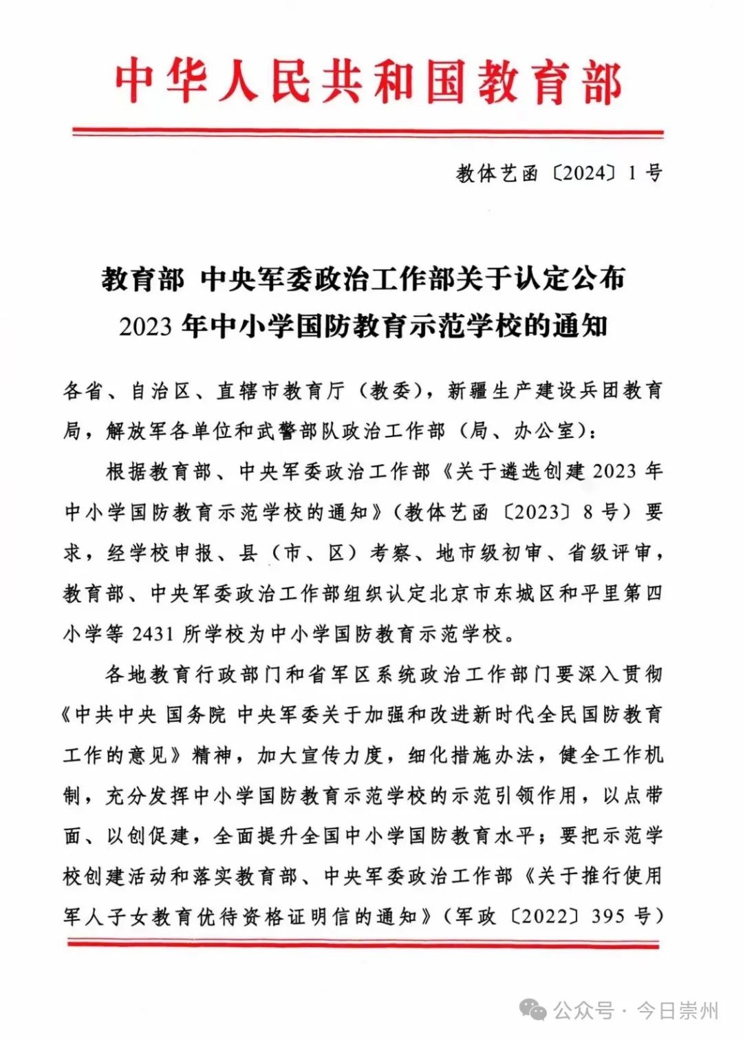 近日,中华人民共和国教育部、中央军委政治工作部发布《教育部 中央军委政治工作部关于认定公布2023年中小学国防教育示范学校的通知》(教体艺函〔2024〕1号),公布2023年中小学国防教育示范学校名单,我市蜀南小学校、王场小学校上榜!