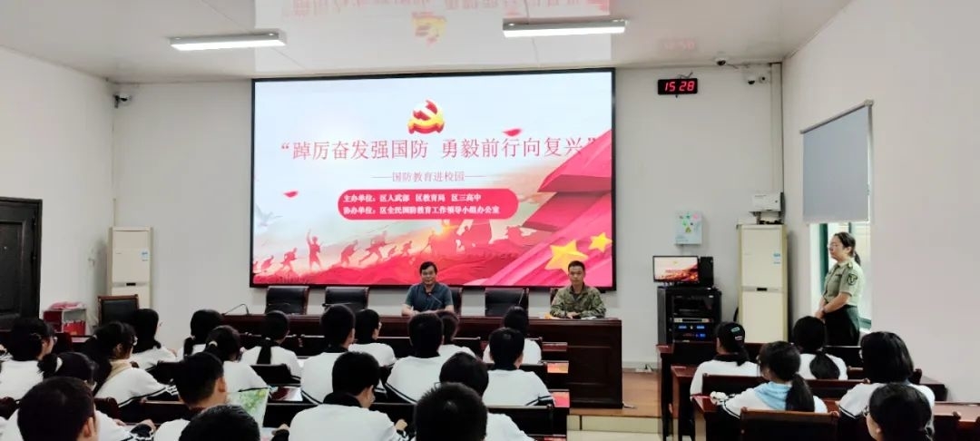 溧水区第三高级中学是一所省三星级普通高中。学校结合国防教育工作的总体要求,以“军训引路、国防育人、军地密切合作”为指导思想,把德育工作与双拥工作有机结合,深入普及和不断加强国防教育,不定期组织学生参加军事训练营、国防教育军事拓展训练等活动。