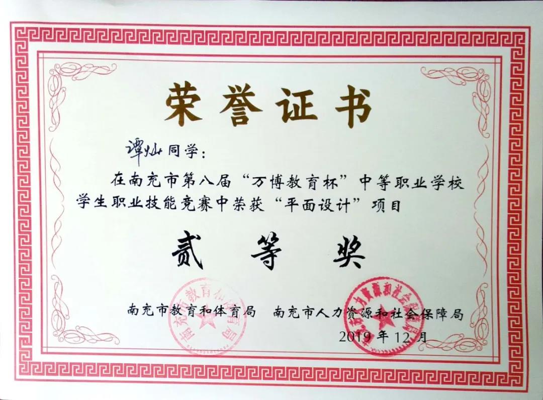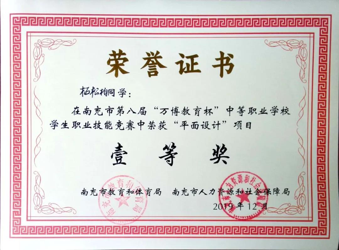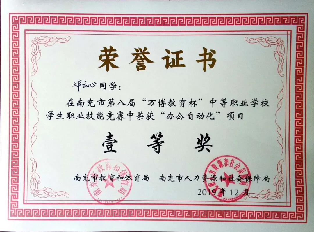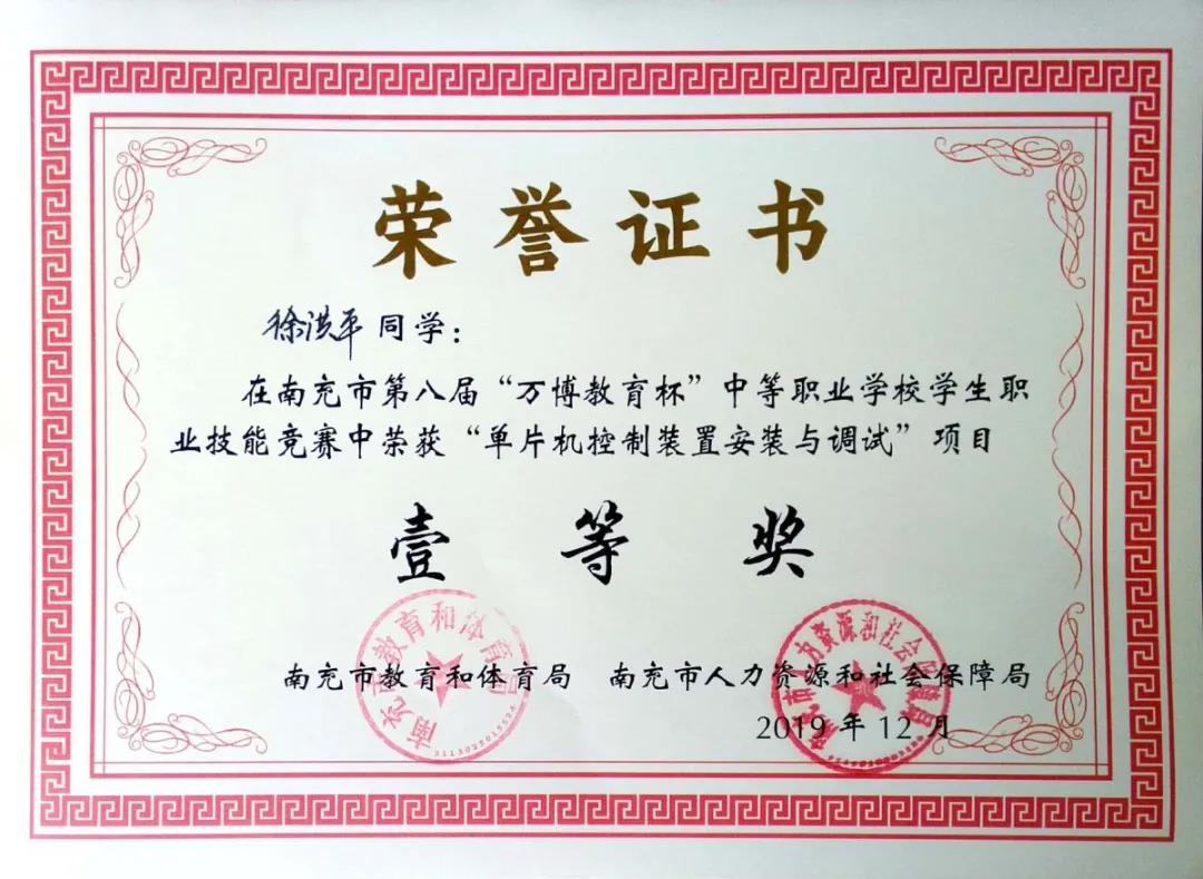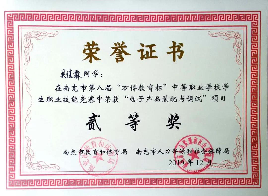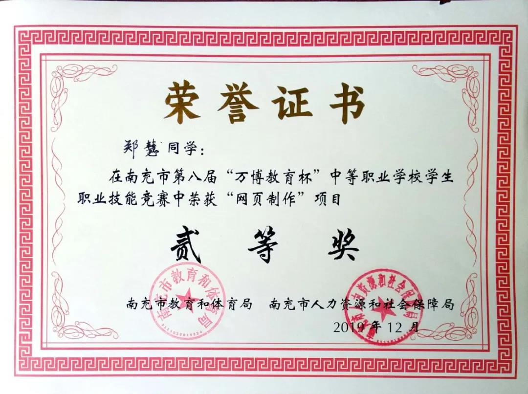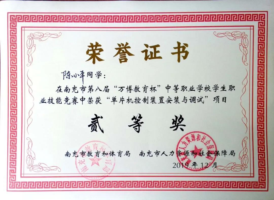 南充市第八届“万博教育杯”学生技能大赛,我校7个参赛项目,分别获得一等奖5名、二等奖4名、三等奖1名,优秀指导教师5名,团体一等奖1个、团体三等奖2个;项目获奖率71%,单项个人获奖率66%,专业大类团体奖获奖率75%,位居全市排名第二。