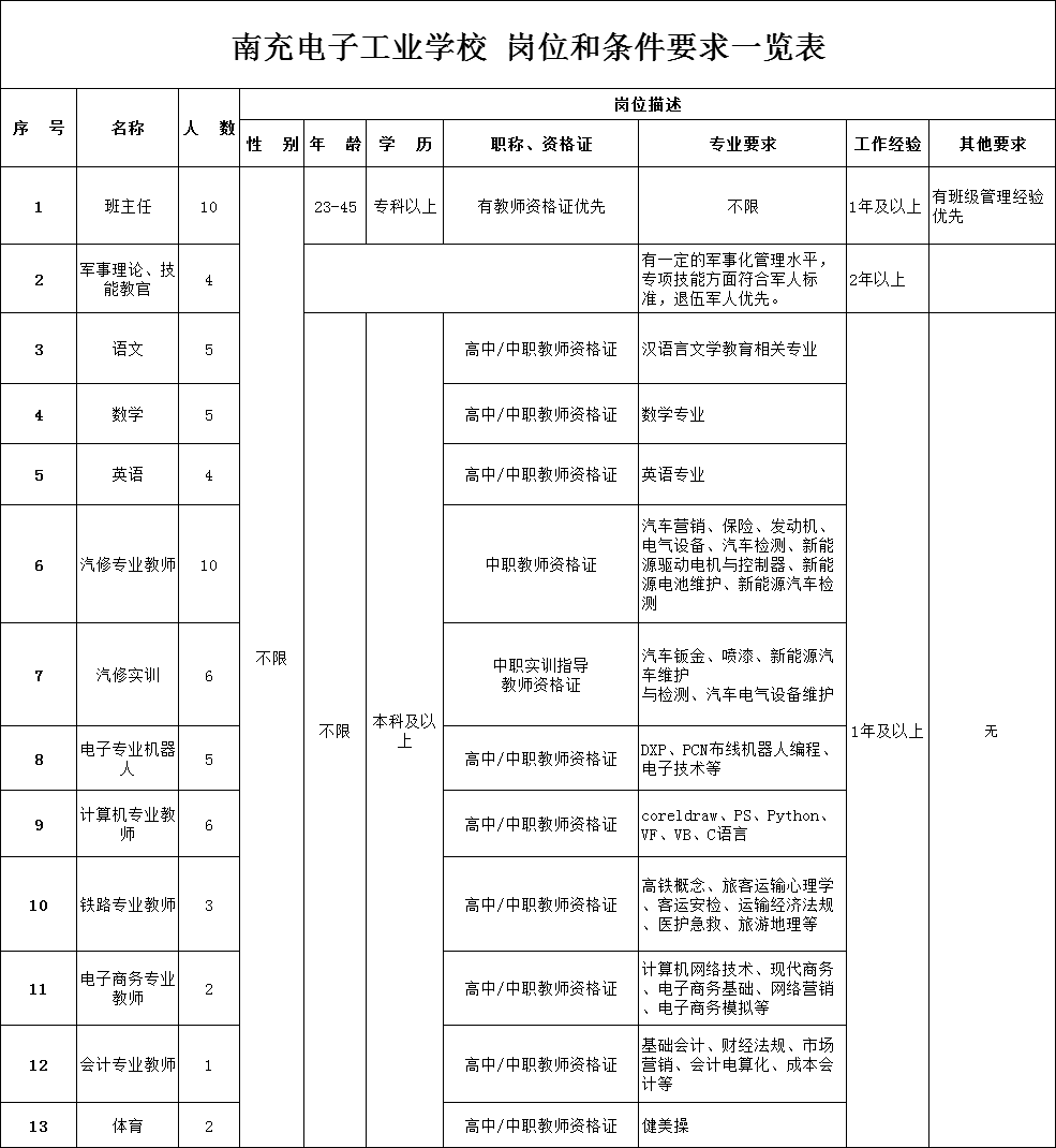 本次招聘具体岗位及名额详见附件《南充电子工业学校 岗位和条件要求一览表》(附件1可下载)。