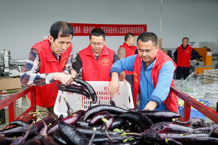 退役军人志愿者帮菜农卸载新鲜蔬菜。