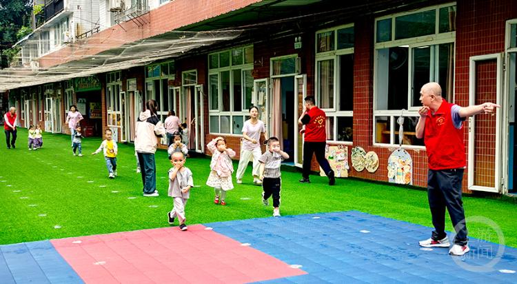 退役军人志愿者引导小朋友开展疏散演练。