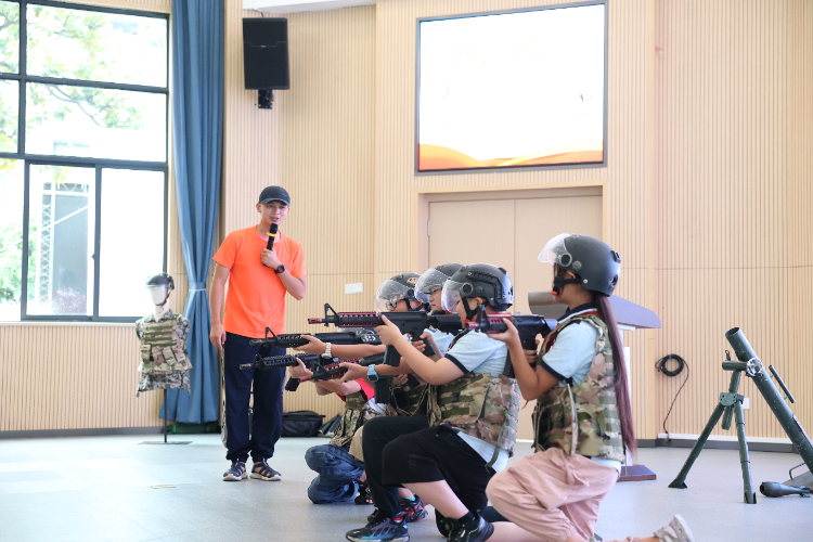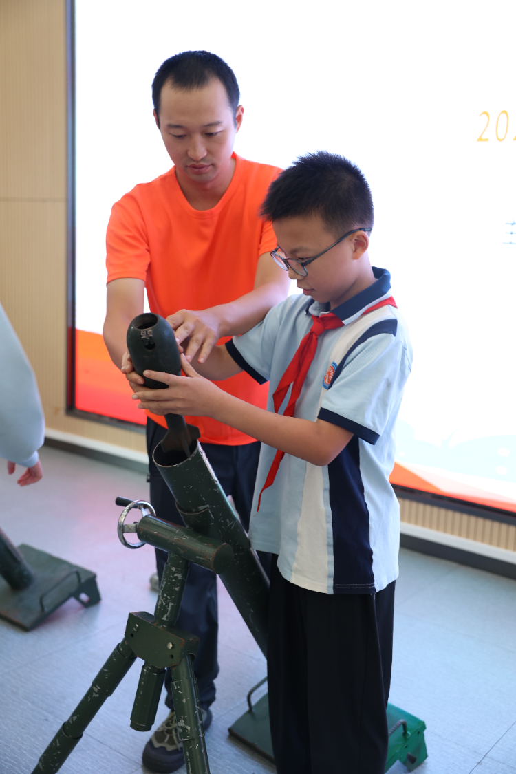 随后,迫击炮、RPG火箭筒、手榴弹等模型陆续出场,吸引了全场目光。老师一边拆解模型结构,一边讲解性能与用途,还邀请学生上手模拟操作。这种“可听、可看、可触摸、可实操”的沉浸式体验,让抽象的国防知识变得直观而深刻,极大地激发了学生的参与热情。