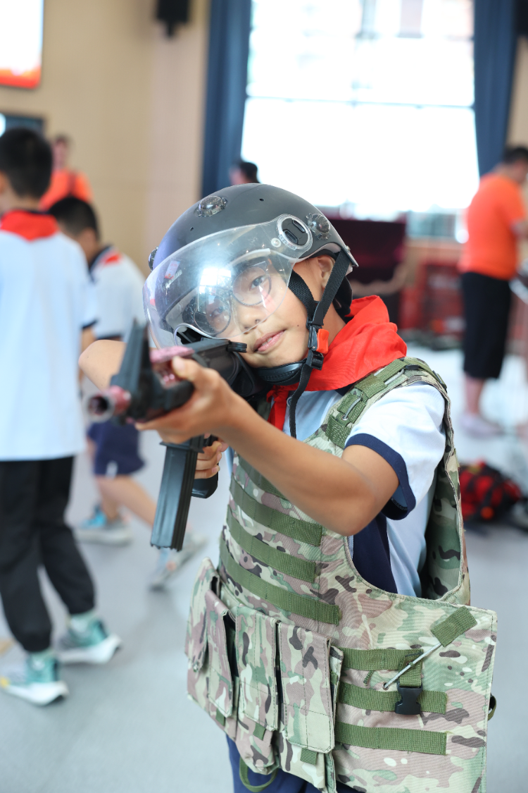 “哇!这个防毒面具好特别!”“这就是发报机吗?”进入互动体验阶段,活动迎来高潮。无人机侦查展示环节,老师操控着无人机盘旋、悬停,讲解其在国防侦查中的作用;绳索救援与水域救援模拟环节,同学们围在一旁认真观察装备的使用方法。在总队老师的耐心指导下,同学们还穿上防护服、戴好防毒面具,亲身感受国防装备的厚重;认真练习海姆立克急救法,掌握互救自救本领;尝试使用发报机发送简单信号,体验战时通讯的紧张与重要。