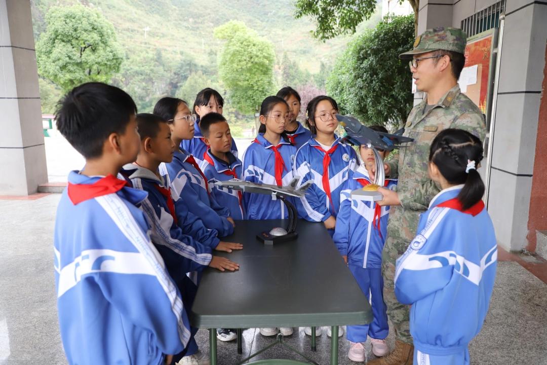最让孩子们热血沸腾的,当属装备体验环节。整齐摆放的装备模型前,官兵们化身“讲解员”,手把手教大家辨认装备型号、讲解功能用途。“这个是用来守护我们领空的吗?”“如果有坏人来,它能一下子把坏人打跑吗?”学生们围着官兵你一言我一语,问题里满是童真与对“守护”的向往,在互动中真切触摸到国防力量的硬核。
