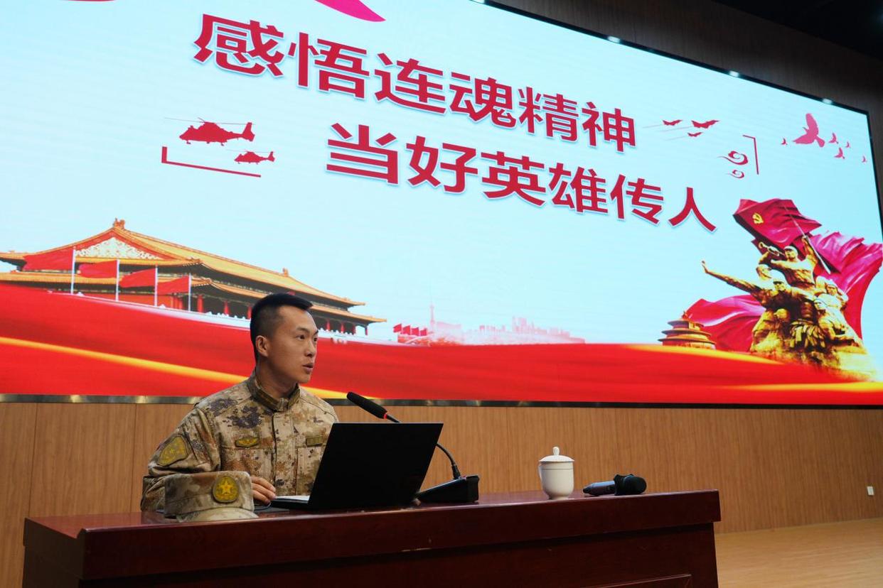 近日,河北省保定市新秀学校与第82集团军某旅“钢八连”联合开展“感悟连魂精神 当好英雄传人”主题国防教育讲座,该连指导员张亚星结合连队光荣历史,通过讲述与交流互动,带领学生们重温英雄故事。(王巧妹、郝占东)