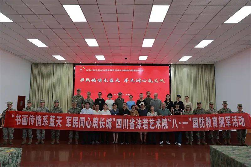 为了庆祝中国人民解放军建军98周年,弘扬拥军爱军光荣传统,向伟大的人民军队表达崇高敬意,四川省沫若艺术院组织艺术家,来到中国人民解放军驻蓉某部,开展“书画传情系蓝天、军民同心筑长城”八•一国防教育拥军活动,为部队官兵送上诚挚的节日问候和祝福。