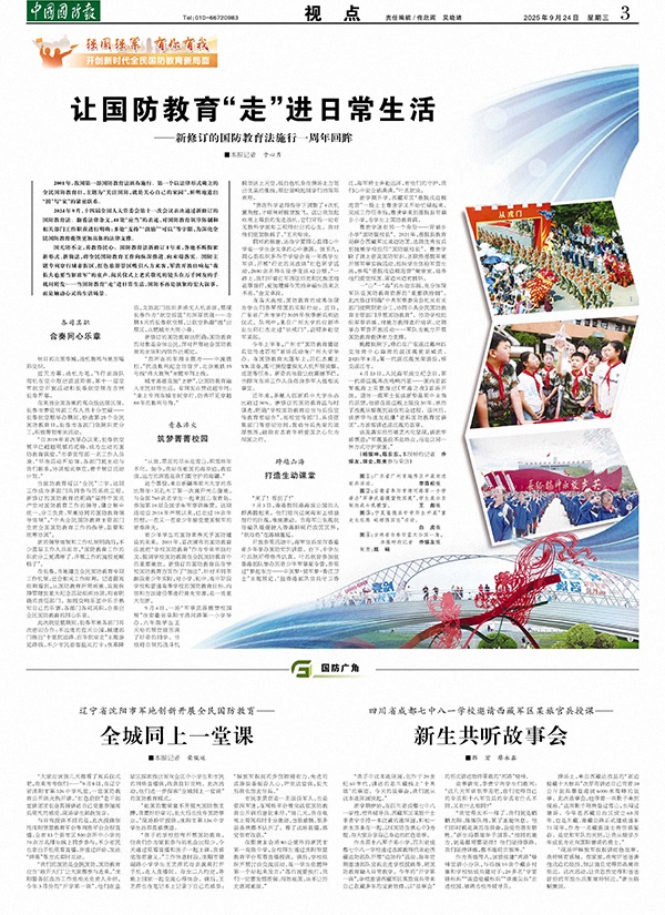 国无防不立,善教得民心。国防教育法新修订1年来,各地不断探索新形式、新做法,将全民国防教育工作向纵深推进、向末端落实。国防主题专列穿行城市街区,红色旅游景区吸引八方来客,军营开放日响起“我长大也要当解放军”的童声,阅兵仪式上老兵敬礼的镜头在万千网友的手机间转发……当国防教育“走”进日常生活,国防不再是抽象的宏大叙事,而是触动心灵的生活场景。