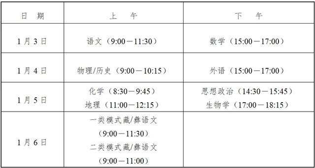 全省高考综合改革适应性演练测试于1月3日—6日统一组织进行。各科目考试时间(北京时间)安排如下: