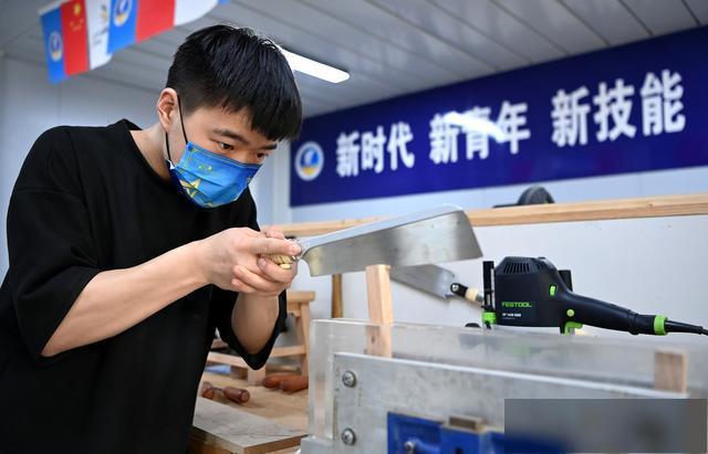 西安建筑工程技师学院学生余家豪在进行精细木工项目训练(4月27日摄)。新华社记者刘潇摄