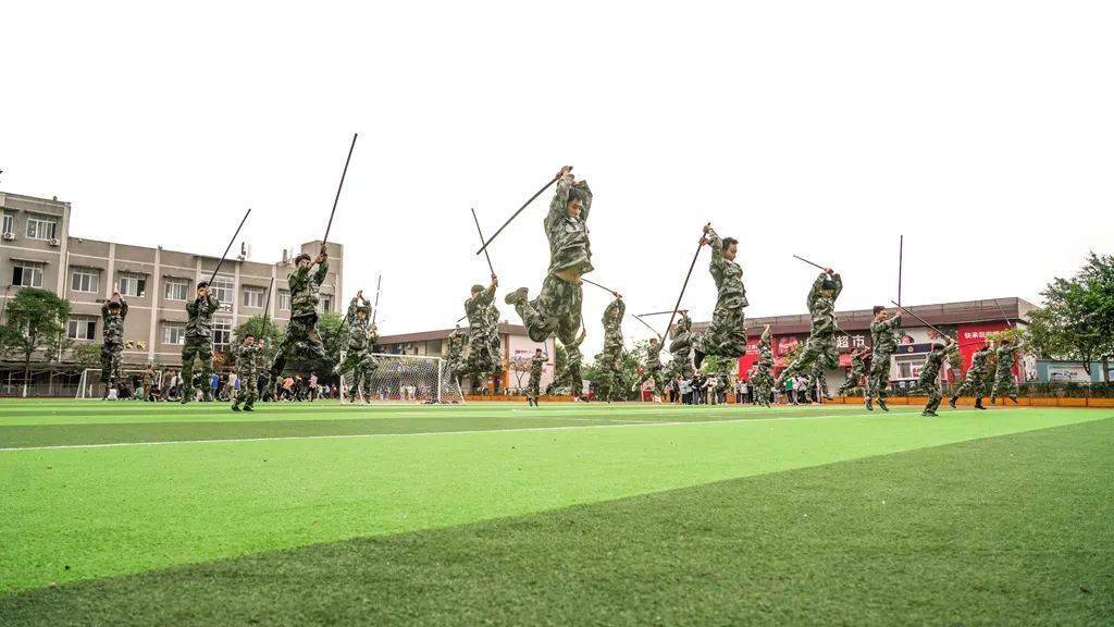 其次,立足课堂,延伸至课余、校外,且基于学生的兴趣爱好和个性特长,创建了多个有“军体”特色的学生社团,有计划、有目的开展学科辅助活动、课外实践活动和其他主题活动,营造“军营生活”情境,如改运动会为“军事对抗赛”,把军事技能融入体育竞技,设置“穿越火线”、运“弹药箱”等比赛环节;改传统大课间为唱军歌、站军姿、做军体操,体验装备模型制作,参加军事知识竞赛……还充分挖掘区域内实践资源,与高坪区档案馆、朱德元帅纪念馆、南充图书馆等开展馆校合作,聘请国防教育领域专家担任课程教师;与武警南充支队、区人武部、区公安局等开展军民共建,组织学生参观军营、体验军旅生活……在全力保障学科学习的同时,有效促进学生的品格形成和全面发展。