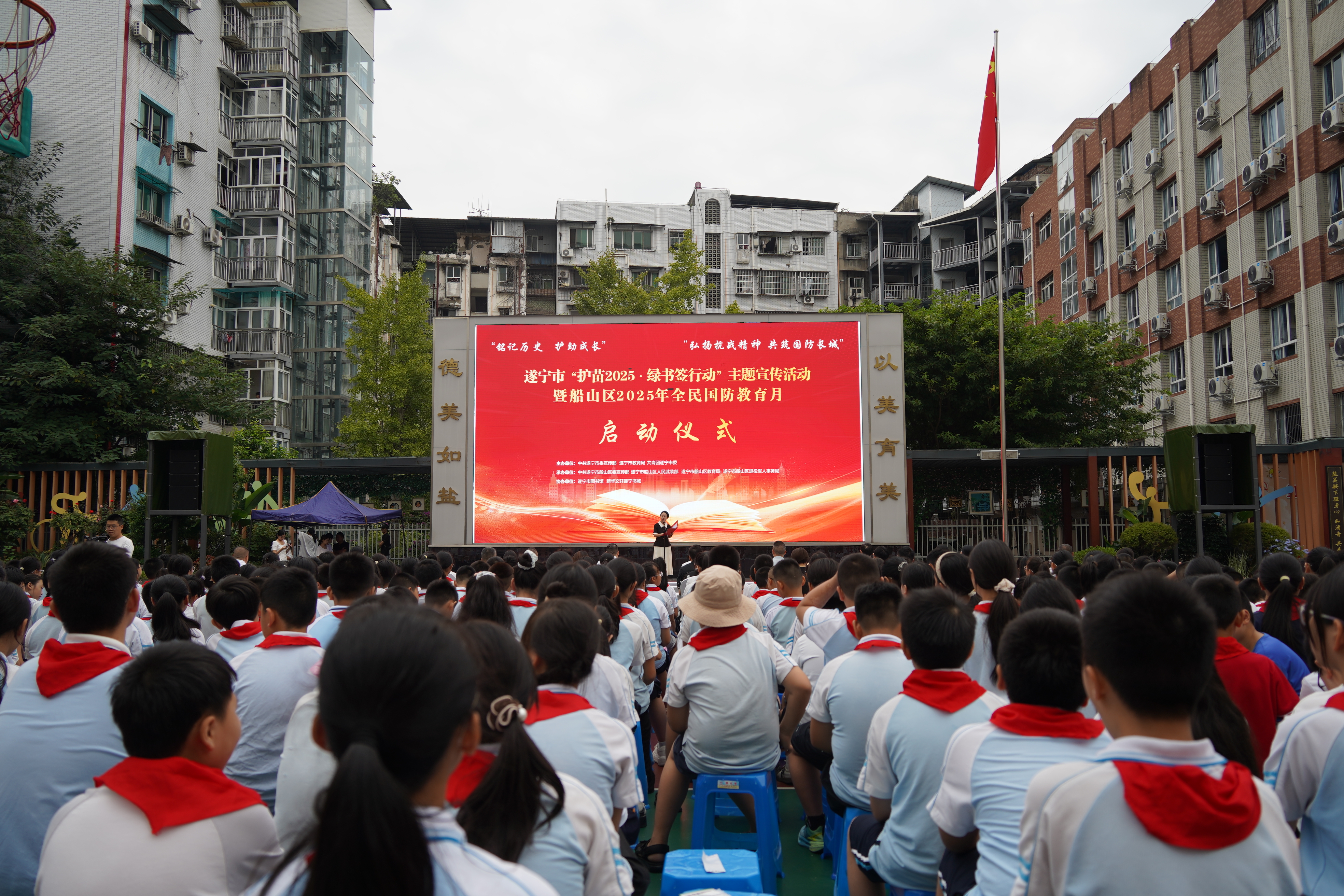 9月16日上午,四川遂宁市“护苗2025·绿书签行动”主题宣传活动暨船山区2025年全民国防教育月启动仪式,在船山区新盐市街小学举行。本次活动由市委宣传部、市教育局、共青团遂宁市委共同主办,船山区委宣传部、区教育局、区人武部、区退役军人事务局联合承办,旨在通过创新形式,将阅读守护与国防教育深度融合,为青少年营造积极向上、爱党爱国的成长环境。