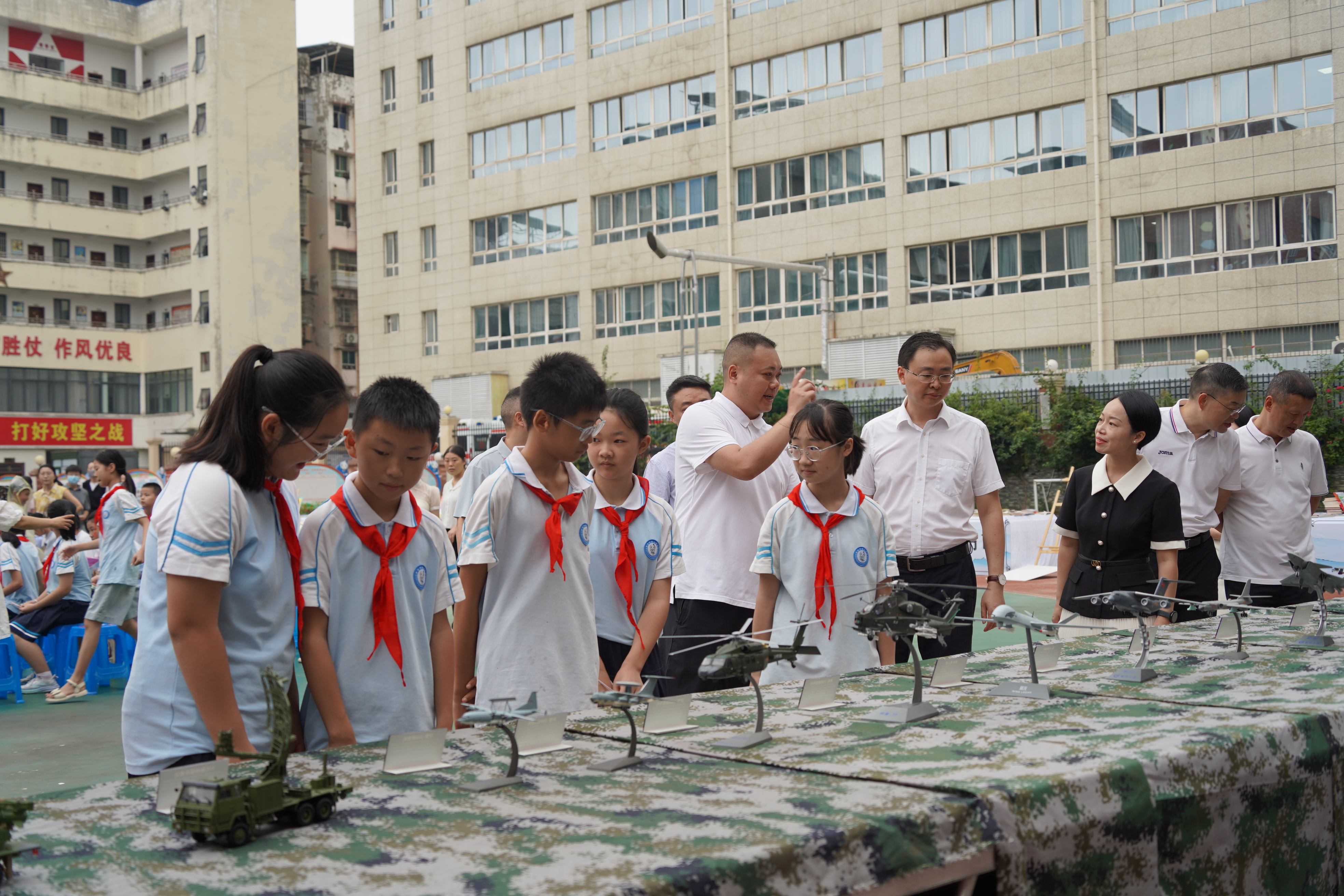 活动以“铭记历史护助成长”和“弘扬抗战精神共筑国防长城”双主题并进。启动仪式前,“好书集市”区已书香弥漫。学生们在“好书推荐”区流连于精选读物,在“漂流读书台”与同伴交换心爱书籍,知识的暖流在校园传递。同步设立的“国防教育及绿书签直播角”和军事模型展,通过主题海报、绘画手工、现代化装备模型等形式,生动直观地普及国防知识,传递绿色阅读理念。